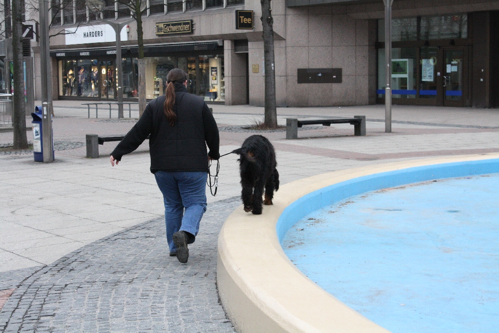 An einem Sonntag Vormittag ist in den Innenstädten nicht viel los. So konnten wir ziemlich ungestört ausprobieren, was so eine Innenstadt an Hindernissen und Herausforderungen beim Stadtagility alles zu bieten hat. Zwei Telefonhäuschen dienten als Tunnel, durch die unsere Hunde laufen sollten. Auf Windschutzrampen konnten unsere Hunde balancieren.