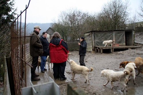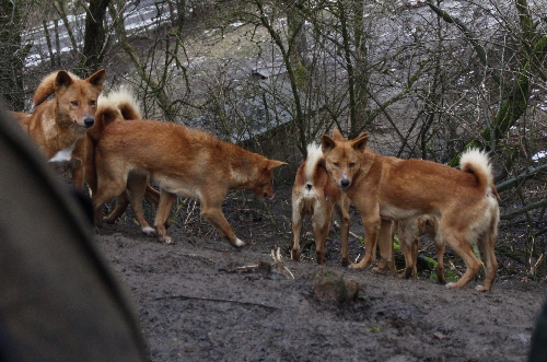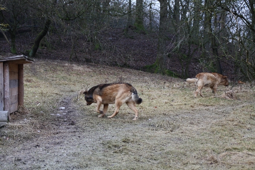 Diese Hunde sind extrem scheu und nicht ganz ungefährlich, sobald man ihnen den Rücken zudreht. Während Frau Trumler erklärte, fotografierte ich die Hunde und ging dabei immer weiter ins Gehege. Die beiden Rüden der Gruppe wichen trotz eines sehr großen Abstands immer weiter nach hinten aus, blieben aber dann in entsprechender Entfernung aufmerksam sitzen.