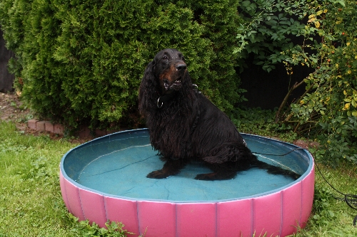 Zurück im Garten angekommen, führte Bibo erst einmal seinen Doggy Pool vor: "So geht Erfrischung!"
