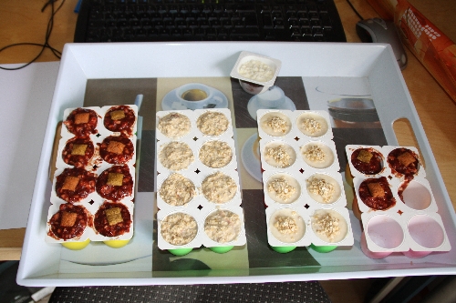Als wir alle 4 Hundeeis Sorten fertig gestellt hatten, kamen die gefüllten Förmchen für die