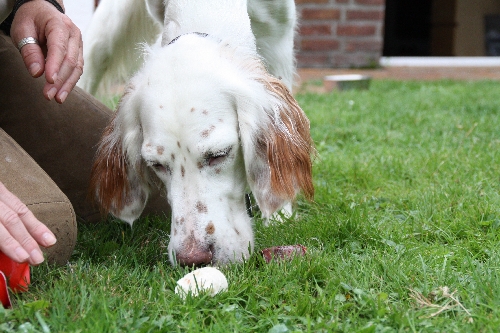 Und dann konnten wir endlich zur Verkostung unseres ersten selbst gefertigten Hundeeises schreiten. Jedem Hund wurden zwei verschiedene Sorten Hundeeis angeboten. Unsere Setter waren zuerst etwas verwundert, dann jedoch sehr dankbar für die Erfrischung. Sie schlabberten beide Portionen genüsslich weg wie nix.