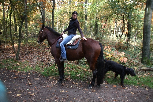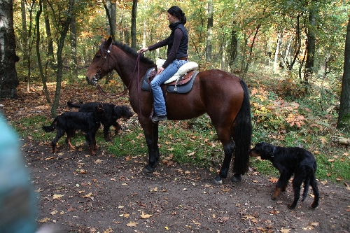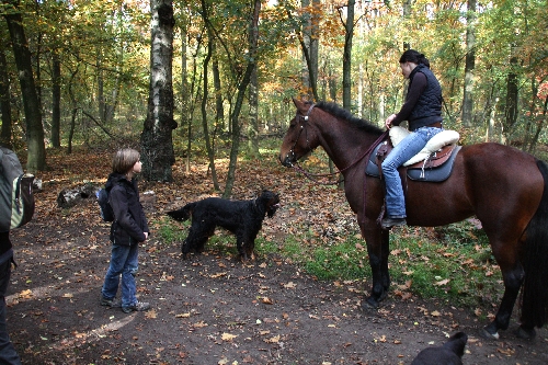 Neben Juttas Iwen sorgte Quincie vom Delmengrund von Annett und Axel für irische Verstärkung. Beim Spaziergang durch den Baerler Busch stellten wir erfreut fest, dass die Spaziergänger und auch die Reiter auf unsere lebhafte Truppe äußerst positiv und freundlich reagierten. Diese Reiterin forderte uns sogar auf, unsere Hunde ruhig an ihrem Pferd schnuppern zu lassen. Er wäre das gewohnt und sollte auch weiterhin mit Hunden in Kontakt bleiben. Bibo fand's jetzt nicht sooo spannend. Er ist Pferde von seinen täglichen Spaziergängen gewohnt. Goofy musste dann doch einmal 'ne Nase nehmen. Und Caruso war äußerst skeptisch und beäugte den "großen Hund" vorsichtigt von vorne.