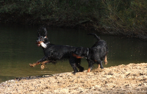 Don (10 Monate alt) hatte etwas am Ufer gefunden, leider Abfall. Er fand's aber super toll und rannte mit "seinem Schatz", einer leeren Plastikflasche, stolz hin und her, damit auch alle sehen konnten, was für ein tolles Ding er da hatte. Nicht nur Goofy (knapp 9 Monate alt) war offensichtlich sehr neidisch und nahm die Verfolgung auf. Auch Greenhorn Quincie (9 1/2 Monate alt) wurde zur Rakete ... sehr albern die drei Flöhe ;o)