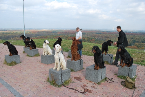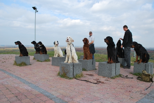 Keine RheinRuhrSetter Aktion ohne ein Gruppenbild in irgendeiner Form. Die Steinquader luden quasi dazu ein, unsere Doggies darauf zu "drapieren". Sieht das nicht goldig aus? Die 11 Strategen ganz artig und platzsparend jeder auf einem Würfel ;o)