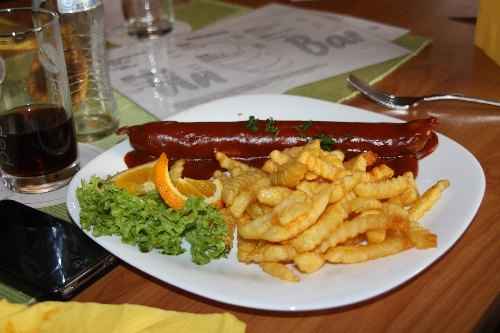 Schließlich kehrten wir mit der gesamten Truppe in die "Unfass-Bar" ein. Wollten wir uns zuerst mit unseren Hunden vor dem Lokal niederlassen, um mit den vielen Füßen und Pfoten nicht zu viel Dreck zu machen, protestierte der Wirt umgehend :o) Er hatte extra für uns den Saal eingedeckt und Näpfe bereit gestellt! Natürlich dürften wir mit unseren Hunden auch IN die "Unfass-Bar". DAS nennen wir wirklich gast- und hundefreundlich und empfehlen das Lokal sehr gerne weiter an Hundebesitzer, die sich vor oder nach einem schönen Spaziergang in der Gegend gemütlich stärken und den Hund dabei haben wollen. Bei größeren Hundegruppen ruft man am besten vorher an und sagt Bescheid.