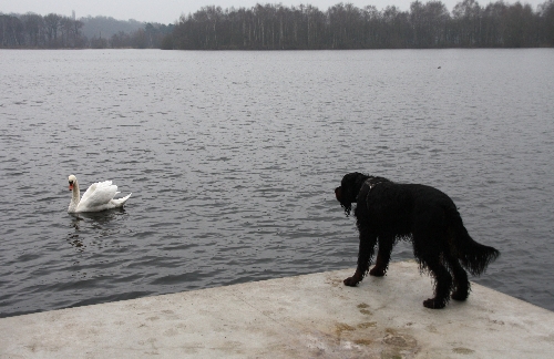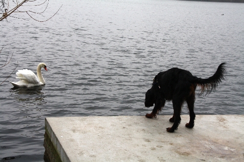 So ein Schwan gehört zwar zur Familie der Entenvögel, ist aber doch um einiges größer. Unsere Hunde fanden den Schwan, der uns bei unserem Spaziergang auf dem Wasser parallel zum Weg ständig folgte, super spannend. Sie dachten scheinbar "Pfff ... Ente ist Ente!" Aber so ein Absprung ins Wasser ... von so einem Plateau ... bei dem Wetter ... zu so einem großen Vogel ... ohne die Gewissheit, dass man Rückendeckung von den Kollegen bekommt ... da muss man doch mal länger überlegen. Nicht wahr, Theo, Caruso, Faro, Hanni ... ? :o)