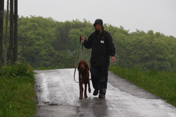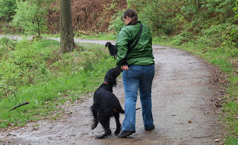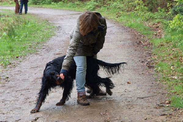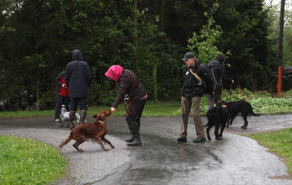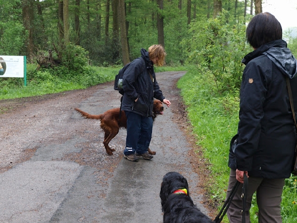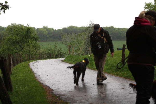 Leider war das Wetter noch schlechter als die Wettervorhersage es prophezeit hatte. Davon ließen wir uns die Laune aber nicht verderben. Los ging's mit einer der einfachsten Drehung, TOGI. Der Hundeführer geht in einem Halbkreis nach rechts, der Hund folgt ihm an seiner Seite. Beide stehen danach anders herum, der Hund wechselt nicht die Seite. Das klappte schon einmal ganz gut.