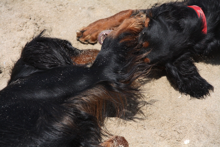 Langsam näherten wir uns wieder unserem Startpunkt. Alex machte uns mit Caruso die "Rolle" vor und lockte Bibo mit entsprechenden Leckerchen auch, über den Strand zu rollen.