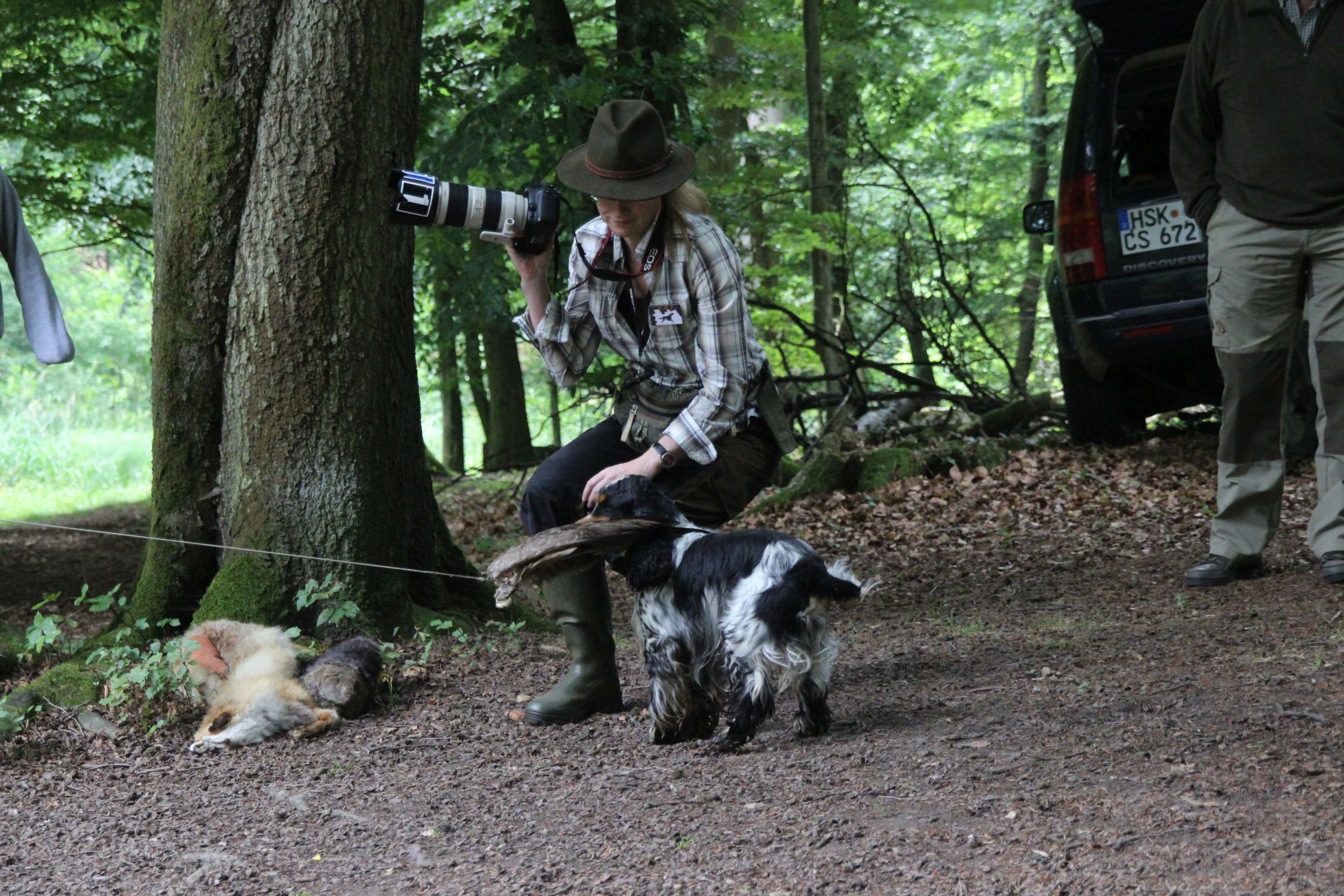 An Da Vinci und Dakar - "den kleinen Terroristen" wie Christian seine English Cocker Spaniel nennt :o) - demonstrierte er, wofür eine Reizangel eigentlich da ist. Sie dient nicht dazu, dem Hund das Hetzen hinter Beute zu ermöglichen (wie es im Fernsehen häufig gezeigt wird), sondern dem Hund beizubringen, auf Kommando des Hundeführers an Wild zu stoppen und Wild gehorsam zu apportieren.